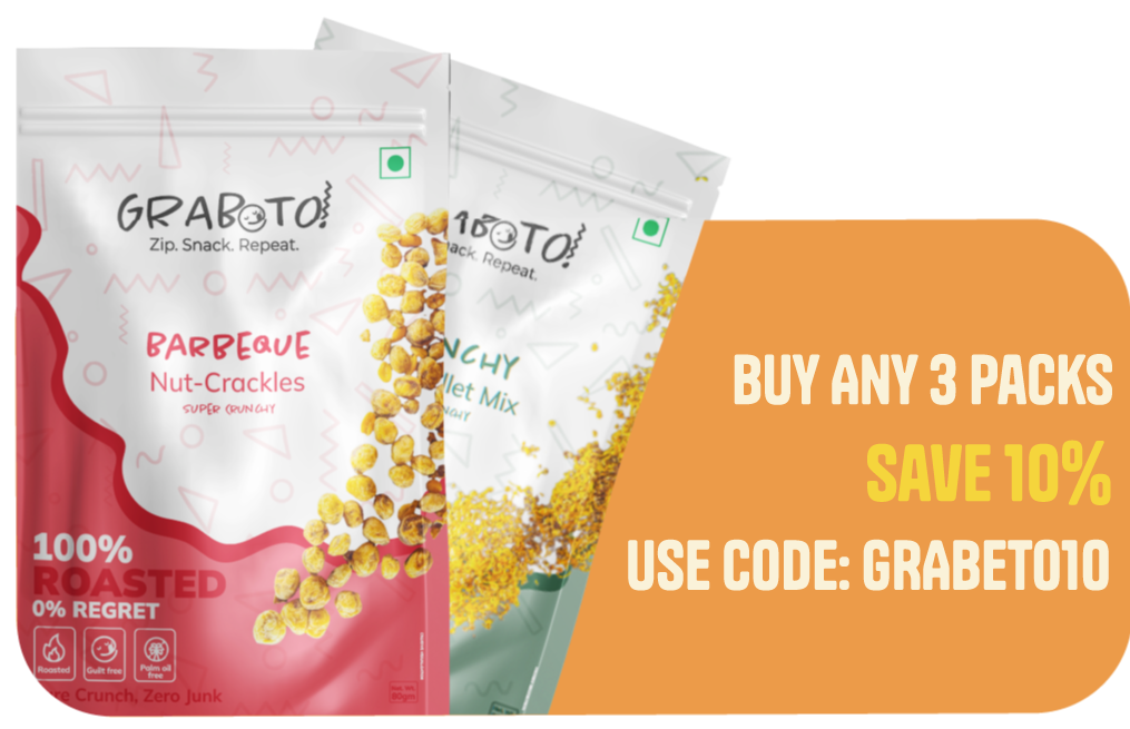 Yes. Every GRABETO snack is 100% Roastedroasted (never fried), contains zero palm oil, and has no added preservatives. Made with real, clean ingredients including ancient grains and plant proteins and certified by FSSAI.