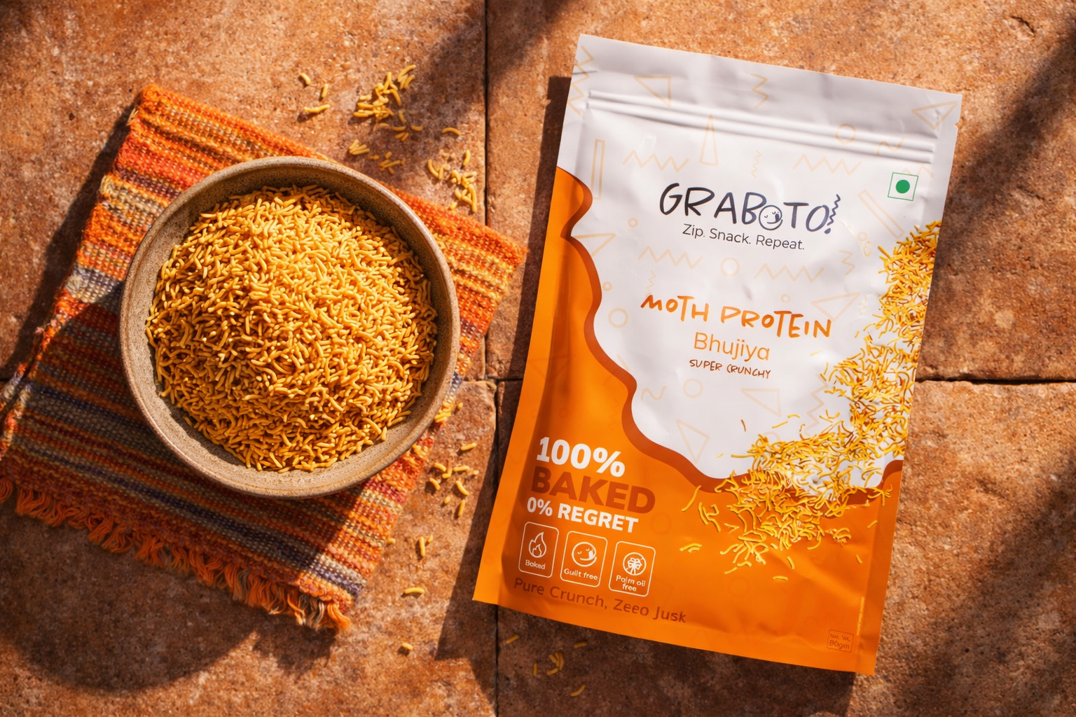 A powerhouse baked bhujiya made from 90% sprouted moth bean flour delivering real plant-based protein, bold Indian spices, and an irresistible crunch in every single bite. No palm oil. No preservatives. Just pure, honest snacking.